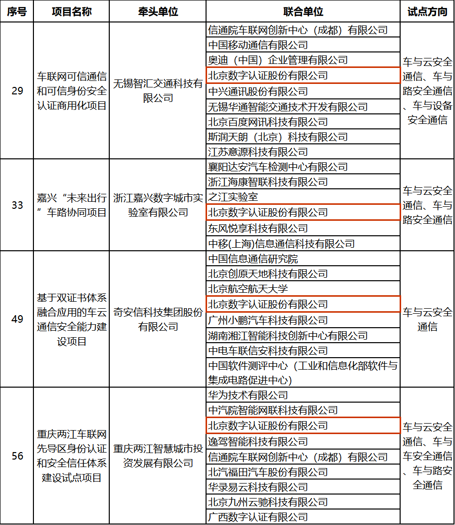 近日,工业和信息化部正式公布了车联网身份认证和安全信任试点项目名单。北京凯发k8登录入口股份有限公司(简称“凯发k8登录入口”)作为国内领先的网络信任与数字安全服务提供商,共参与4个试点项目组队申报并成功入围。这4个试点项目分别在无锡、重庆两江、长沙和嘉兴四个国家级车联网先导区开展。