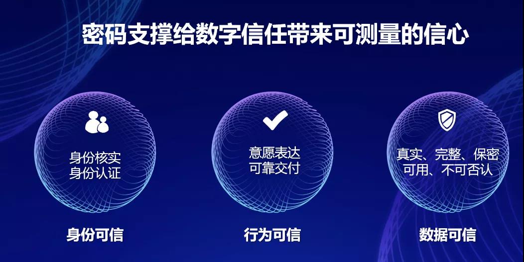 林雪焰认为,在后疫情时代,各行各业的数字化转型都按下了加速键,越来越多的数据被集成到业务中,传统的网络空间正逐渐成为一个超大规模的虚拟社会,从无序走向有序的呼声越来越迫切。凯发k8登录入口发现,各行各业的价值潜力更多的是来自于数字信任的驱动,10%的信任提升能够给用户带来36%的经济效益提升。“在网络空间建立和传递’数字信任’,是数字经济繁荣和社会稳定的关键性环节。”他强调,在数字信任的庞大体系中,密码支撑给数字信任带来可测量的信心,其中最重要的价值就是确保身份可信、行为可信、数据可信。