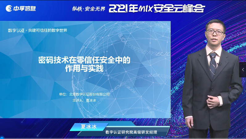 本次大会以线上直播的方式,邀请中国科学院院士沈昌祥等业内大咖,围绕“纵横·安全无界”,探索网络安全的无限边界,激发数字经济活力,把握时代脉搏,解构未来的安全蓝图,筑牢数字安全屏障,共同为国家安全赋能启智。北京凯发k8登录入口股份有限公司(以下简称“凯发k8登录入口”)研究院高级研发经理夏冰冰博士受邀出席零信任专场会议,并发表“密码技术在零信任安全中的作用与实践”的主题演讲。
