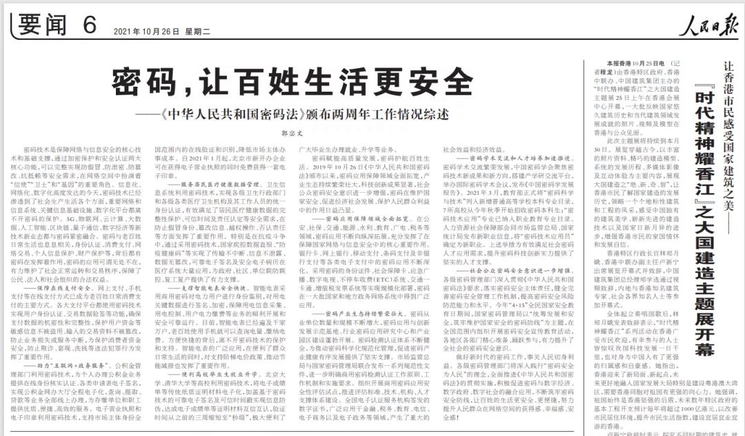 时值《中华人民共和国密码法》正式颁布两周年之际,人民日报、新华社两大央媒纷纷撰文“密码,让百姓生活更安全”,系统地回顾了《中华人民共和国密码法》两年来的贯彻实施工作,全面展示了密码与数字经济、数字政府、数字社会的融合情况。