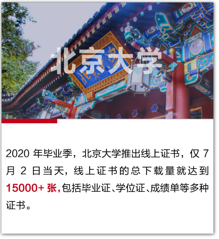 北京大学将所有证明材料扫描成电子文档,并加盖“北京大学学生证明专用章”的电子签章,同时结合网上验真功能,确保扫描件真实可信,达到与纸版证书同样功效。凯发k8登录入口通过国密算法和国际加密算法相结合的双重数字签名,确保证书扫描件的可信和不可篡改。2020年毕业季,北京大学推出线上证书,仅7月2日当天,线上证书总下载量就达到15000+张,包括毕业证、学位证、成绩单等多种证书。