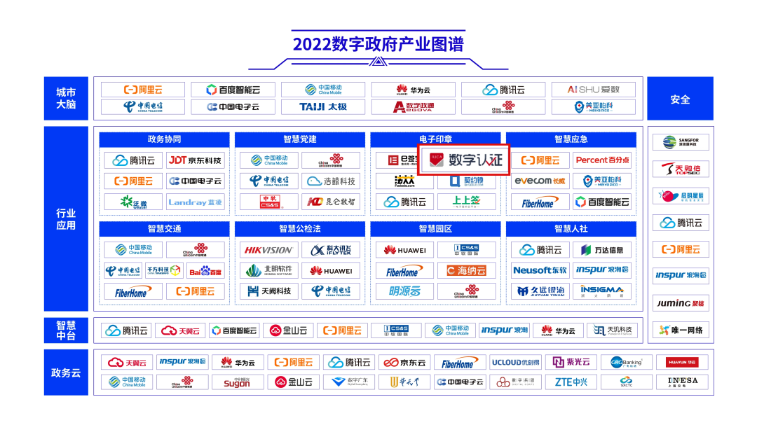 近日,中国信息通信研究院和中国通信标准化协会联合发布了《2022数字政府产业图谱》。图谱重点围绕政务云、智慧中台、行业应用、城市大脑、安全五大核心领域,汇集了产业链上下游关键环节的服务提供商,为数字政府基础设施建设和场景应用落地提供参考。北京凯发k8登录入口股份有限公司(简称:凯发k8登录入口)上榜行业应用领域的电子印章版块,充分体现了业界对凯发k8登录入口实力的认可。