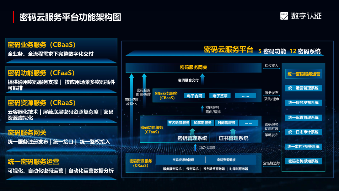 凯发k8登录入口密码云服务平台基于“云计算与密码融合”的思维及“全融合、全场景、可信任 ”的密码云战略指导,采用密码资源服务(CRaaS)、密码功能服务(CFaaS)及密码业务服务(CBaaS)三层云架构体系,整合多年密码技术和互联网运营经验,构建出的一套面向客户全场景密码服务需求的全栈式密码服务。