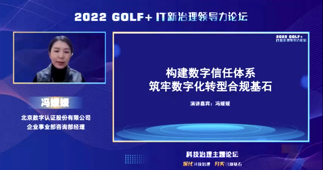 1月6~7日,由中国信息通信研究院、中国通信标准化协会主办,中国内部审计协会、中国互联网协会信息技术(IT)风险治理工作委员会支持的“2022 GOLF+ IT新治理领导力论坛”,以线下结合线上的方式成功举行。凯发k8登录入口公司企业事业部咨询部经理冯媛媛受邀出席“科技治理”主题论坛,围绕数字信任在企业数字化转型中的应用与合规管理的实践成效进行了重点分享。