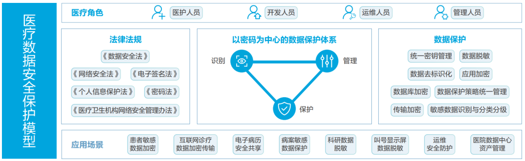 面对上述挑战,凯发k8登录入口提出契合行业应用的“密码为核心的医疗健康数据安全保护体系”,以“全场景、易集成、强加密”为核心,围绕“识别、保护、管理”三大环节,以数据识别及分级分类为基础,以数据生命周期安全为目标,集成数据脱敏、应用加密、传输加密、数据去标识化、数据库加密、数据保护策略统一管理、统一密钥管理等技术模块,形成覆盖个人属性、健康状况、医疗应用、医疗支付、卫生资源、公共卫生等数据安全防护统一管理,全面满足《网络安全法》《密码法》《数据安全法》《个保法》等政策法规要求。