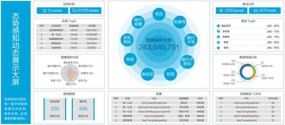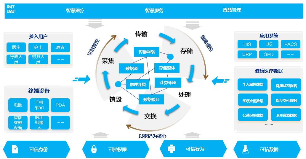 以医疗业务逻辑为主导,基于分类分级结果、业务访问规则和密钥体系,实现统一决策、可信身份管理、可靠密钥管理等可信管控,以及实现数据访问态势感知、数据保护情况监测等策略管控。