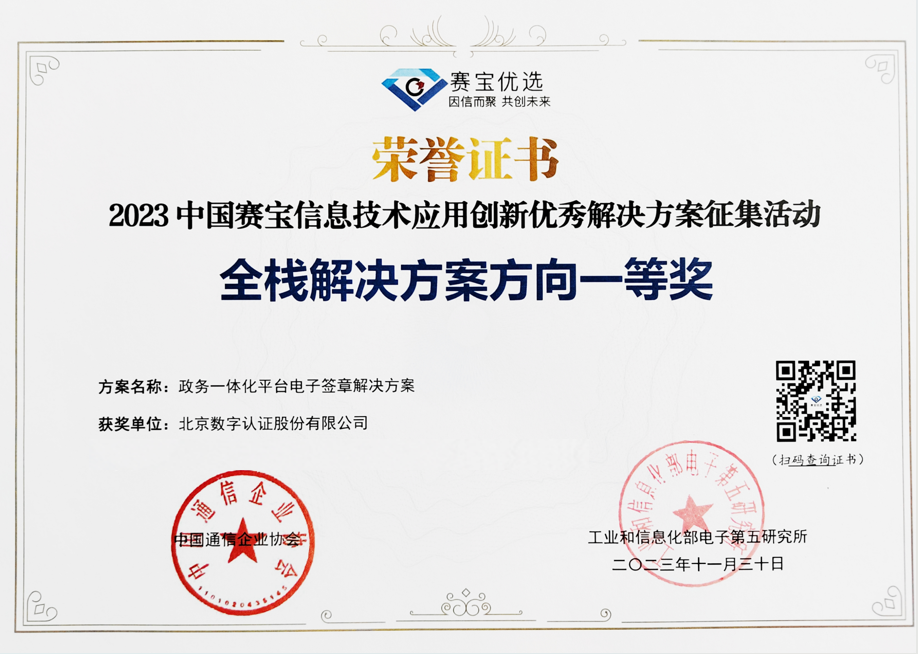 11月30日,在2023(第四届)数字化转型推动高质量发展大会现场,2023中国赛宝信息技术应用创新优秀解决方案征集活动的颁奖仪式隆重举行。北京凯发k8登录入口股份有限公司报送的“政务一体化平台电子签章解决方案”在决赛的激烈角逐中成功胜出,荣获全栈解决方案方向一等奖。