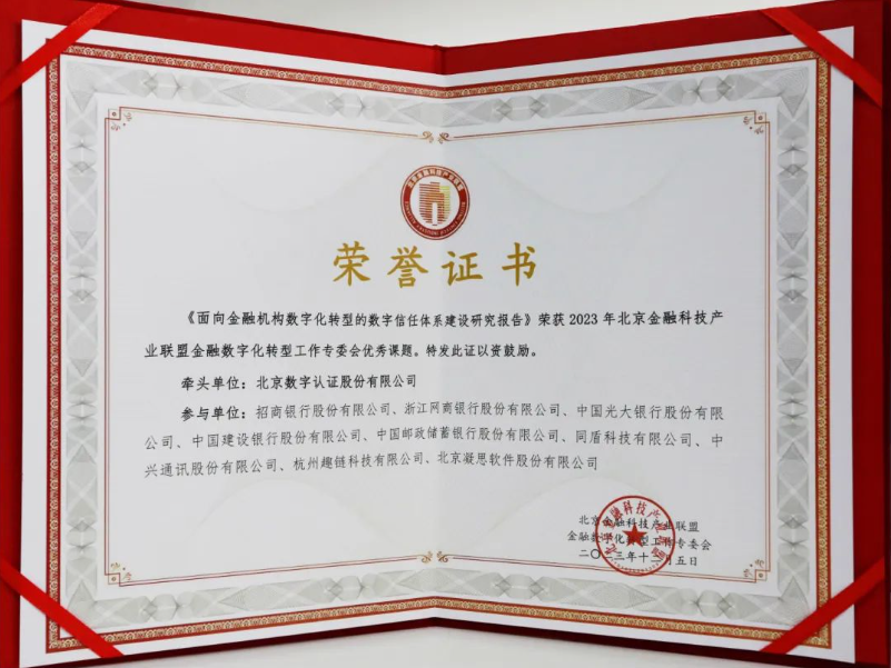 近日,由北京金融科技产业联盟主办的“金融数字化转型研讨会”在山东济南召开。会议同期,联盟对金融数字化转型工作专委会2023年优秀课题进行了表彰。其中,北京凯发k8登录入口股份有限公司(简称:凯发k8登录入口)牵头,联合招商银行、网商银行、光大银行、建设银行、邮储银行等参编单位,共同完成的《面向金融机构数字化转型的数字信任体系建设研究报告》被评为优秀课题。