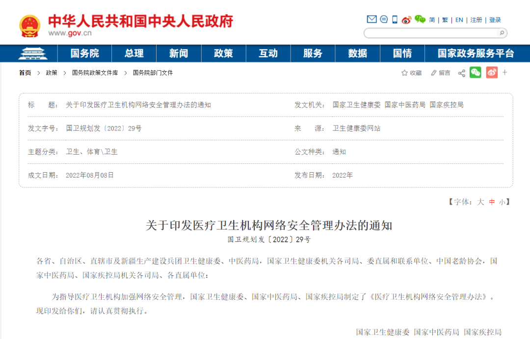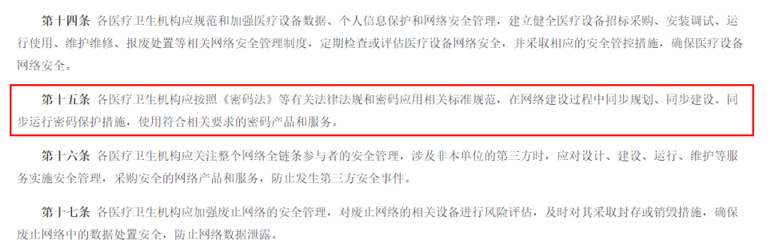 《医疗卫生机构网络安全管理办法》出台,密码应用建设作为重点任务被多次提及