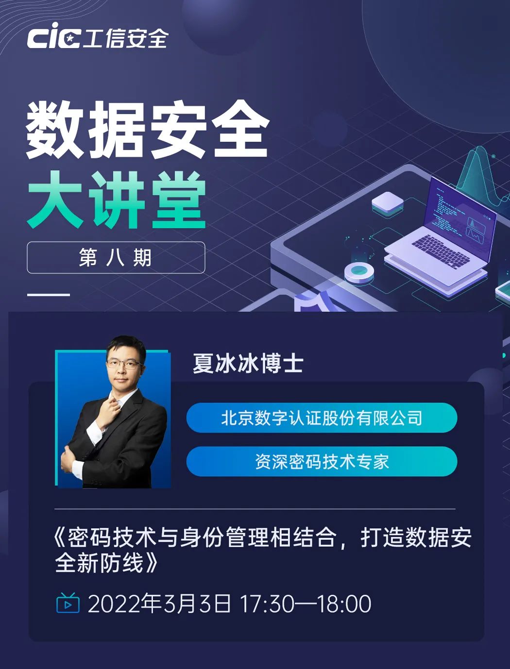 2022年3月3日,由国家工业信息安全发展研究中心主办的 “数据安全大讲堂”准时在线开讲。北京凯发k8登录入口股份有限公司的资深密码技术专家夏冰冰博士也应邀带来了《密码技术与身份管理相结合,打造数据安全新防线》的重磅课程,引发众多网友线上热议。