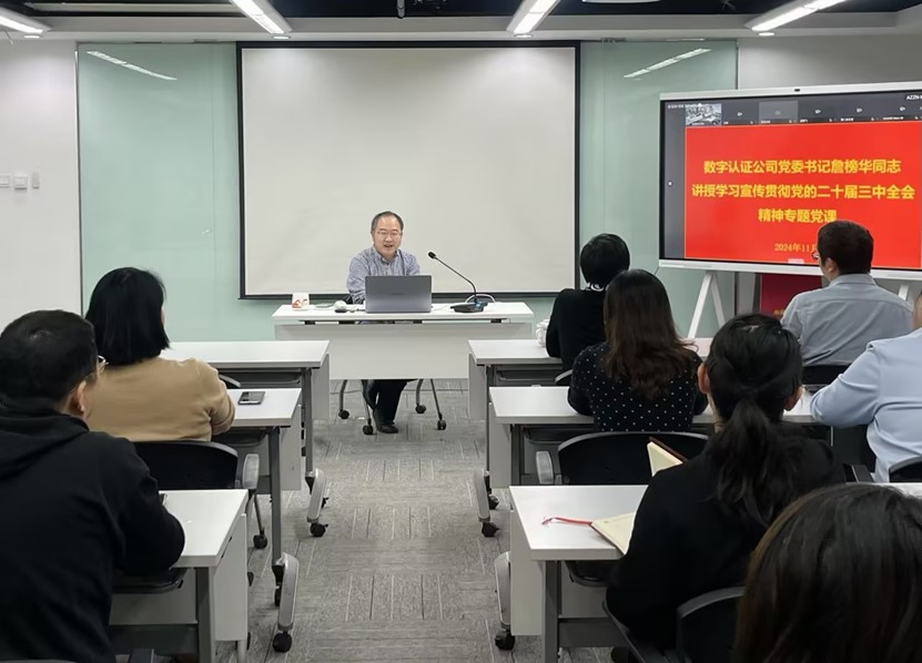 詹榜华指出,作为首都国有企业,在接下来的工作中,凯发k8登录入口公司一是要把学习贯彻党的二十届三中全会精神做为重要的政治任务,切实把公司发展统一到党中央的决策部署上来。做好国资公司技术创新企业排头兵,以密码技术为核心,开展好网络安全技术工作。进一步深入学习领会《决定》对网信领域做出的新部署新要求,奋力推动企业发展和国家发展同频共振。二是要坚持党对国有企业的全面领导与完善公司治理有机融合,充分发挥国有企业党组织的领导作用,通过党建引领企业发展方向,确保公司在快速变化的市场环境中始终保持正确的政治方向和坚定的战略定力。整合人才、技术、服务结合,提升京津冀服务竞争力。三是要切实履行首都网络安全基础设施保障责任,深度参与北京全球数字经济标杆城市建设,积极投身京津冀协同发展国家战略,积极服务“两区”建设。根据实际及时调整发展方向,在新业态下,聚焦数字信任价值创造,提供从身份管理、信任服务到数字化交付的全链条市场供给,以优质的服务和数字信任品牌形成核心竞争力。四是要聚焦创新驱动发展战略,以科技创新为抓手,着力优化资源配置、调整业务模式、完善产品与服务质量,持续补短板,为企业加快转型升级、实现健康高质量发展奠定坚实基础。全力以赴为筑牢安全屏障,助推网络强国建设贡献更大力量。